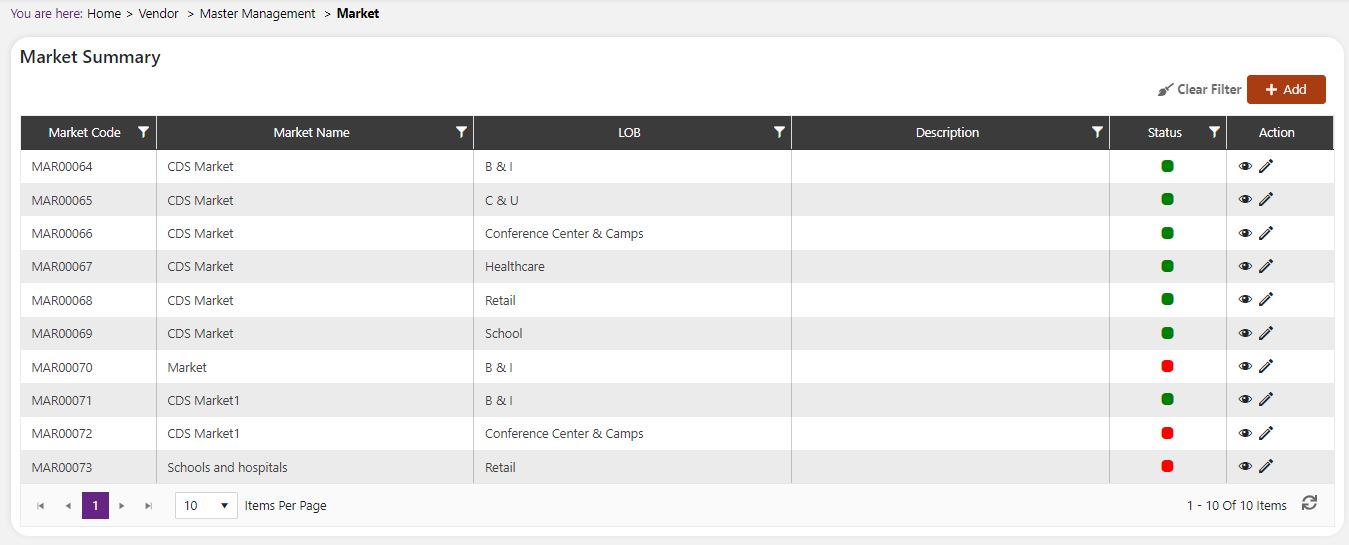 Markets represent various regions where different pricing can be managed. For example, the same vendor may provide different prices for the same products in different regions of the country. If this is the case, you can setup different Markets and associate them to the accounts that operate in those regions. One or more Markets can be associated to a specific price sheet for each vendor. The account will see pricing that is associated to the Market which is assigned to them. You can control which Markets are available to each LOB, account, and price list.