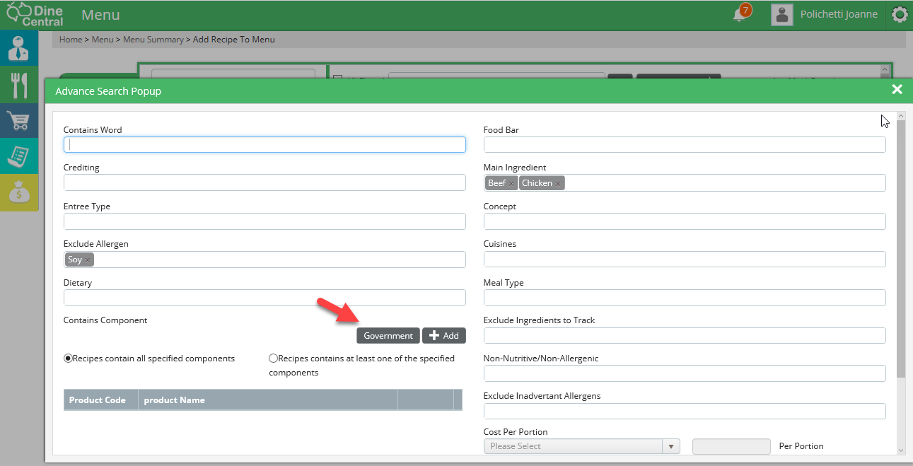 Clicking on the Government button will display a list the Government