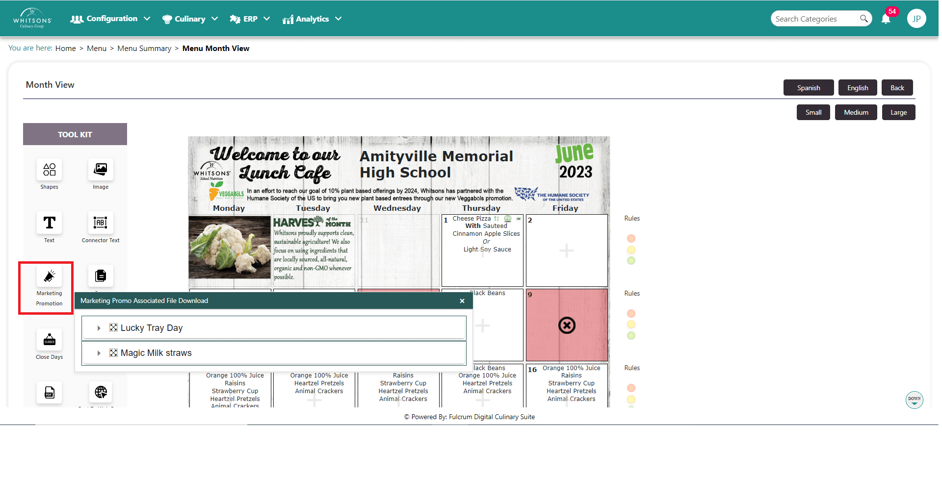 On the Menu screen, click the Marketing/Promotion button (left side). A popup screen will appear with valid marketing promotions for month (relevant to the location and meal period and date). Inside each selection, DC will show you all the files associated with the promotion available for download, as well as the name of the promotion to put on your menu.