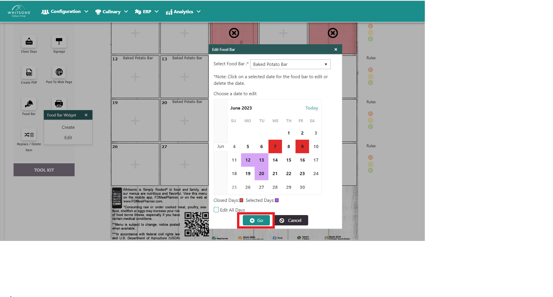 Choose the dates you will offer the Food Bar. Selected dates will be highlighted. You can also Select All Days by clicking on the box below the calendar.