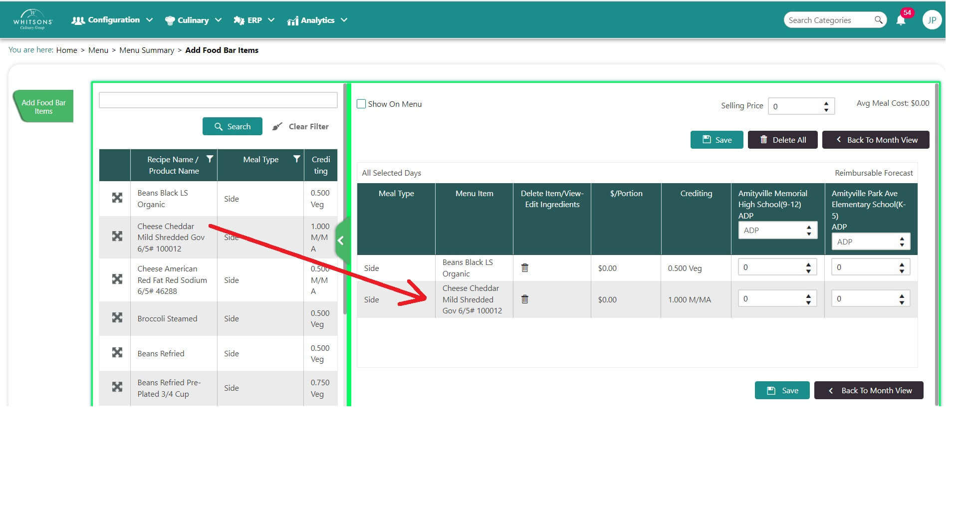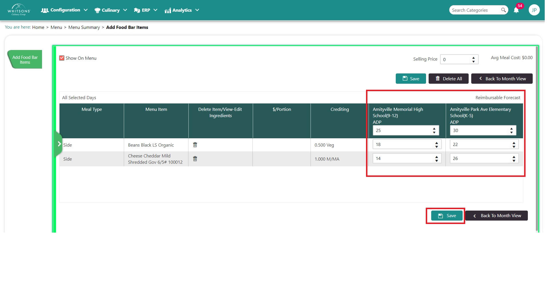 NoteThe ADP box at the top of the screen MUST be filled in for the number of entrees you expect to serve from the food bar for each location on the menu.