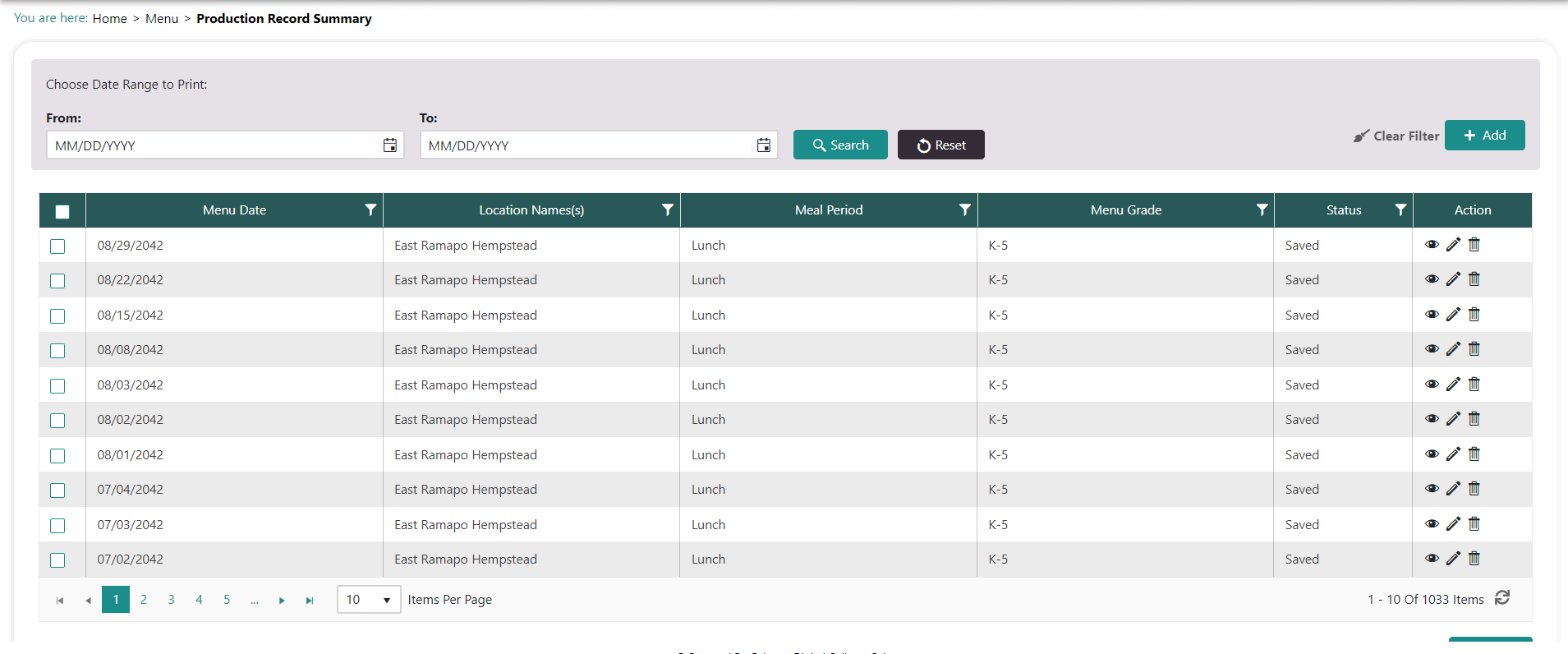 Navigate to the Master serving line (make sure that the food bar drop down is blank so you are viewing all of the info on the production record).
