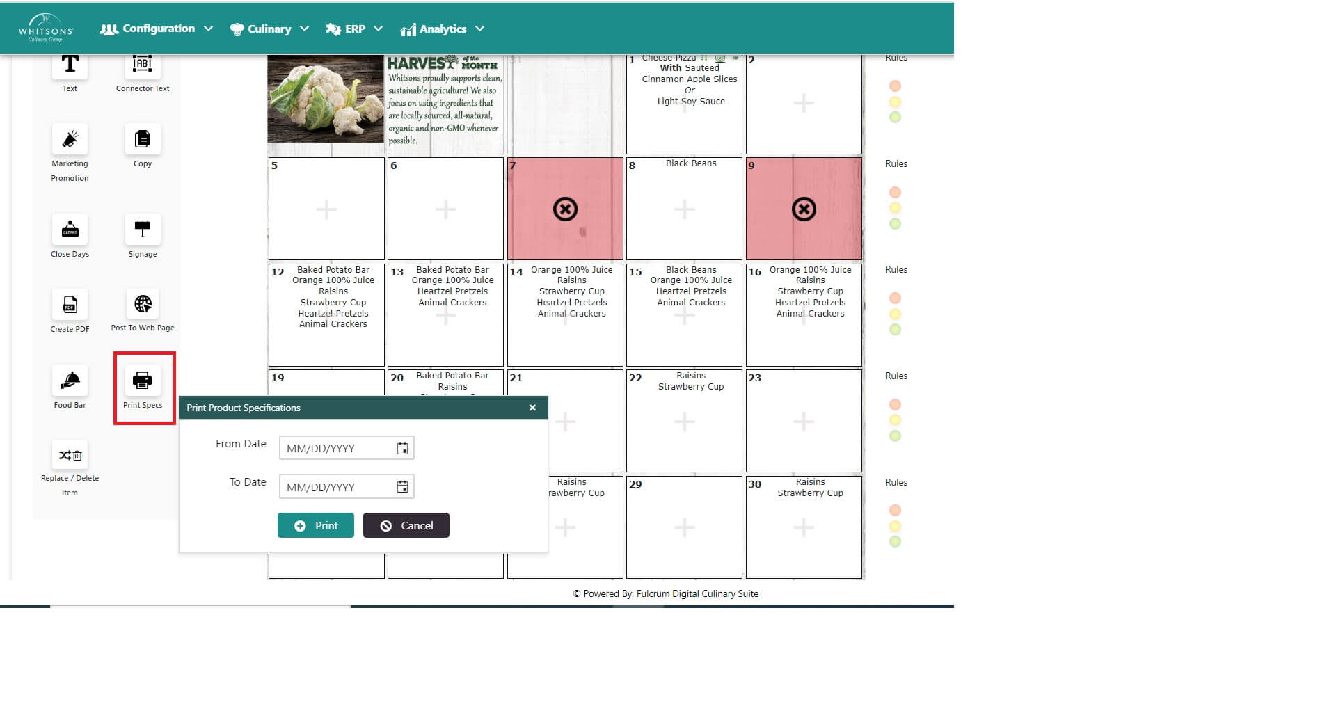 On the Menu screen, click the Print Specs button (left side). A popup screen will appear.
