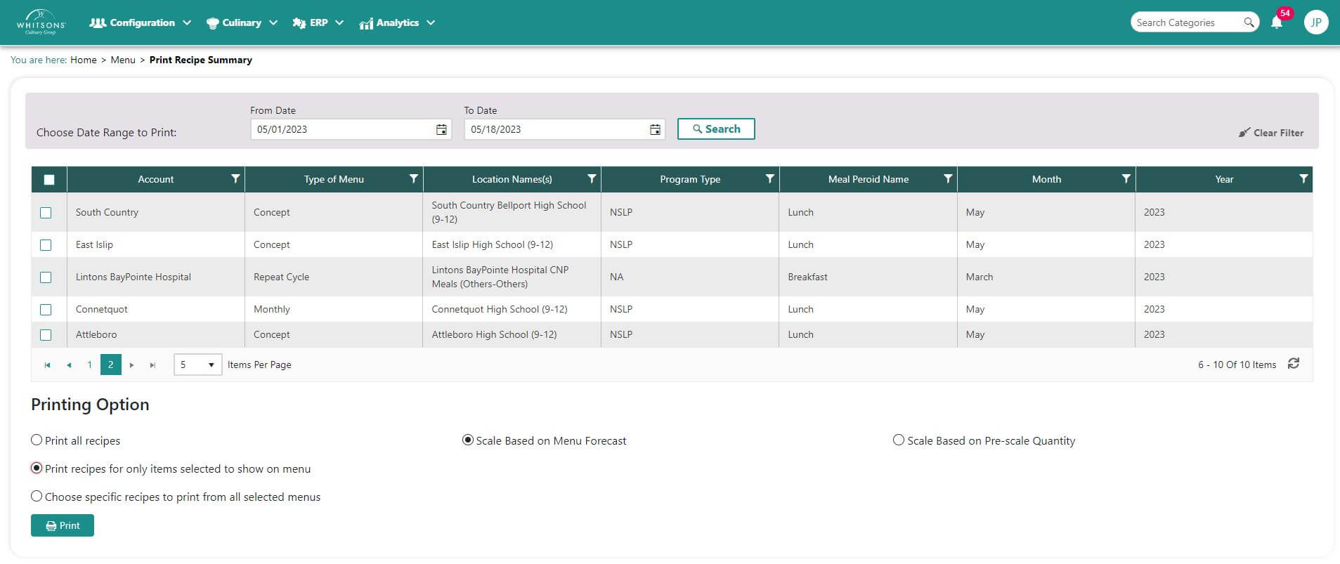 Enter the date range and click Search for available menus.\ Select a printing option: