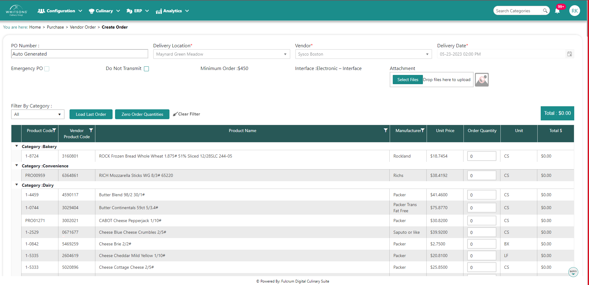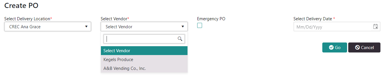 Choose the delivery location, vendor and delivery date. The delivery date will autofill to the next scheduled date. Only current and future dates are selectable. If you change the delivery date you will receive a warning notification "You are attempting to change the delivery date". Despite the date you indicate, DineCentral will default to the next delivery date.