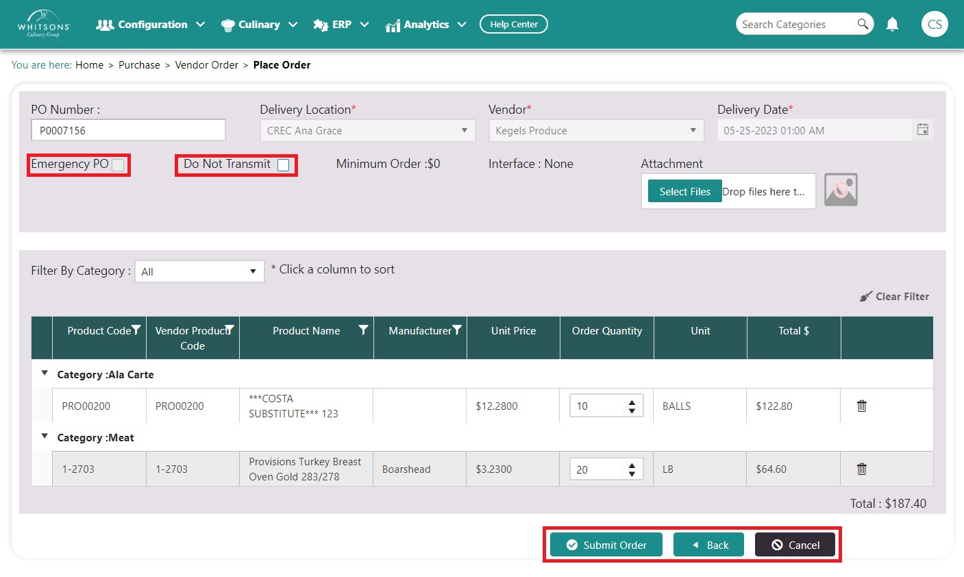 Select "Do Not Transmit" checkbox if you do not want the purchase order to electronically transfer to the vendor.