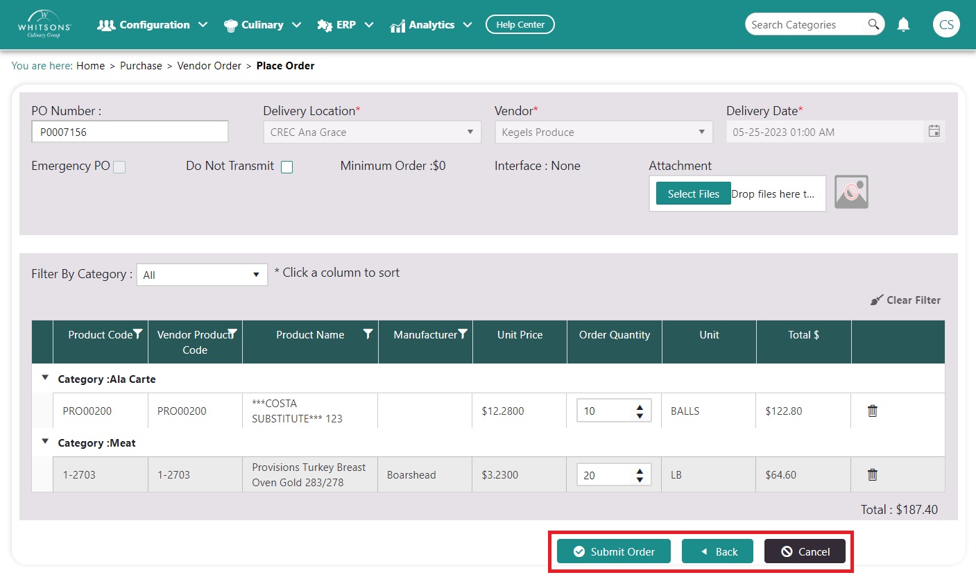 A new PO number will be generated at the top of the Purchase Order Summary page.