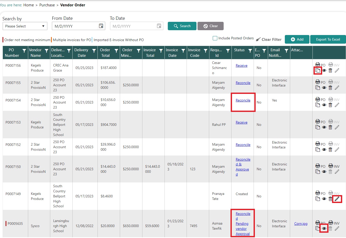 On the Vendor Order page, DineCentral will display the purchase amount in dollars as a running total of items as they are being added to the vendor order. The amount will appear in a orange strip on the top right section of the screen. When you scroll down, the orange strip will move along with it.