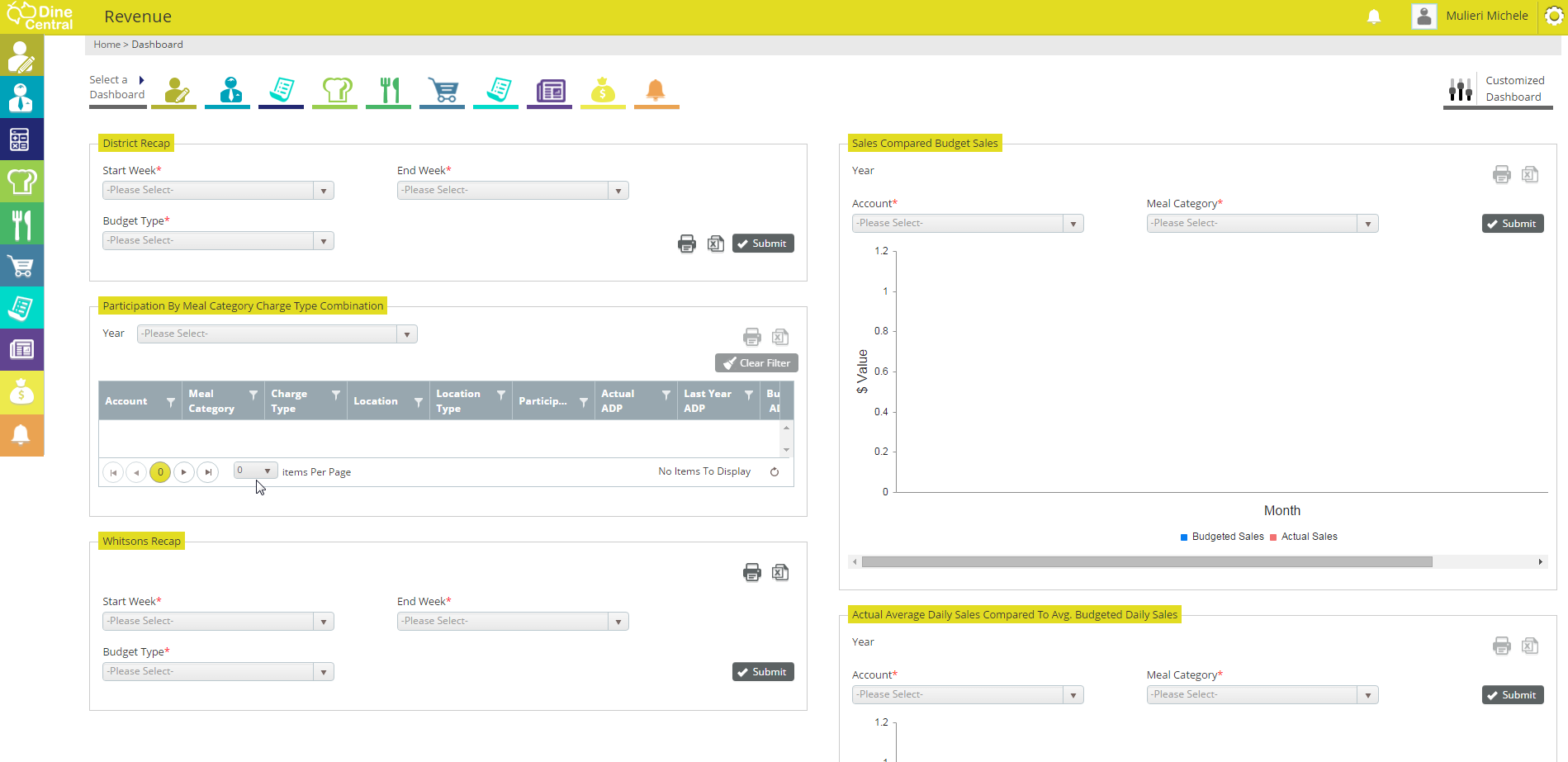 For your convenience, six report dashboards have been created so you can view the performance of your account(s): District Recap, Sales Compared Budgeted Sales, Whitsons Recap, Actual Average Daily Sales Compared to Avg. Budgeted Daily Sales and Meals Per Labor Hour. Each of the Revenue dashboards may sorted, filtered, drilled-down, then exported Excel and/or printed.