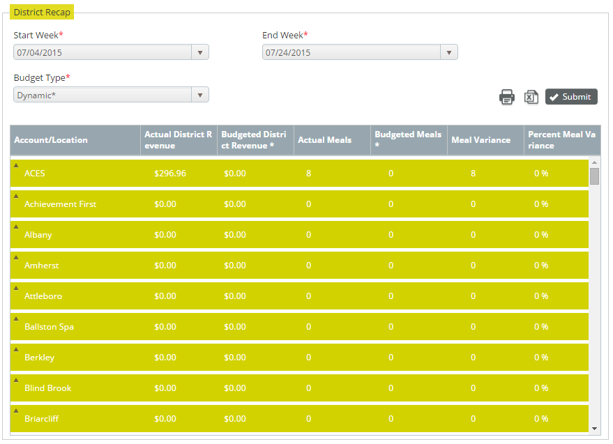 Dynamic: Display the budgeted meals and budgeted district revenue based on actual operating days.