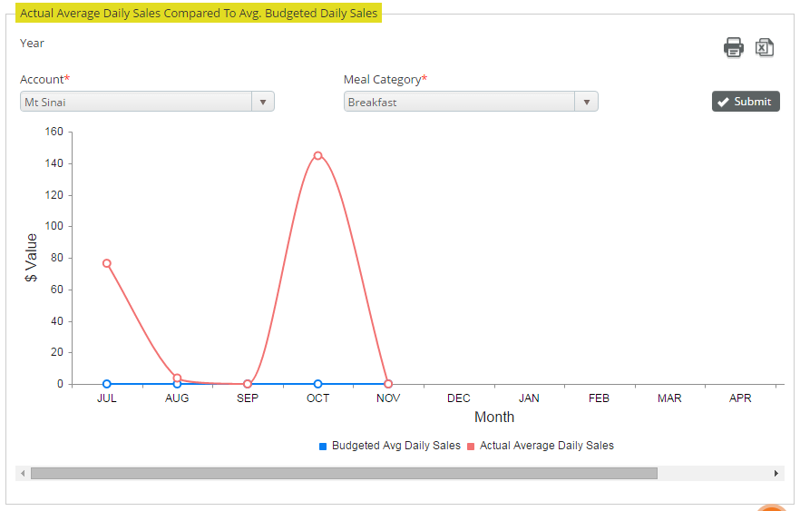Choose your report parameters in the Actual Average Daily Sales Compared to Avg. Budgeted Daily Sales section: Account and Meal Category.