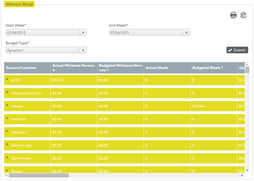 Choose your report parameters in the Whitsons Recap section: Start Week, End Week and Budget Type.