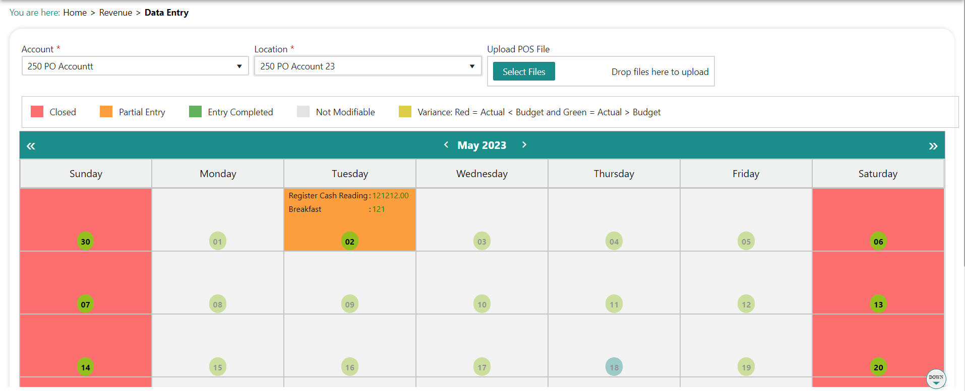 The numbers on a calendar date represent the total meal counts or sales entered for the categories noted. These numbers are compared with the values in the budget module and are color coded to alert you to variations.