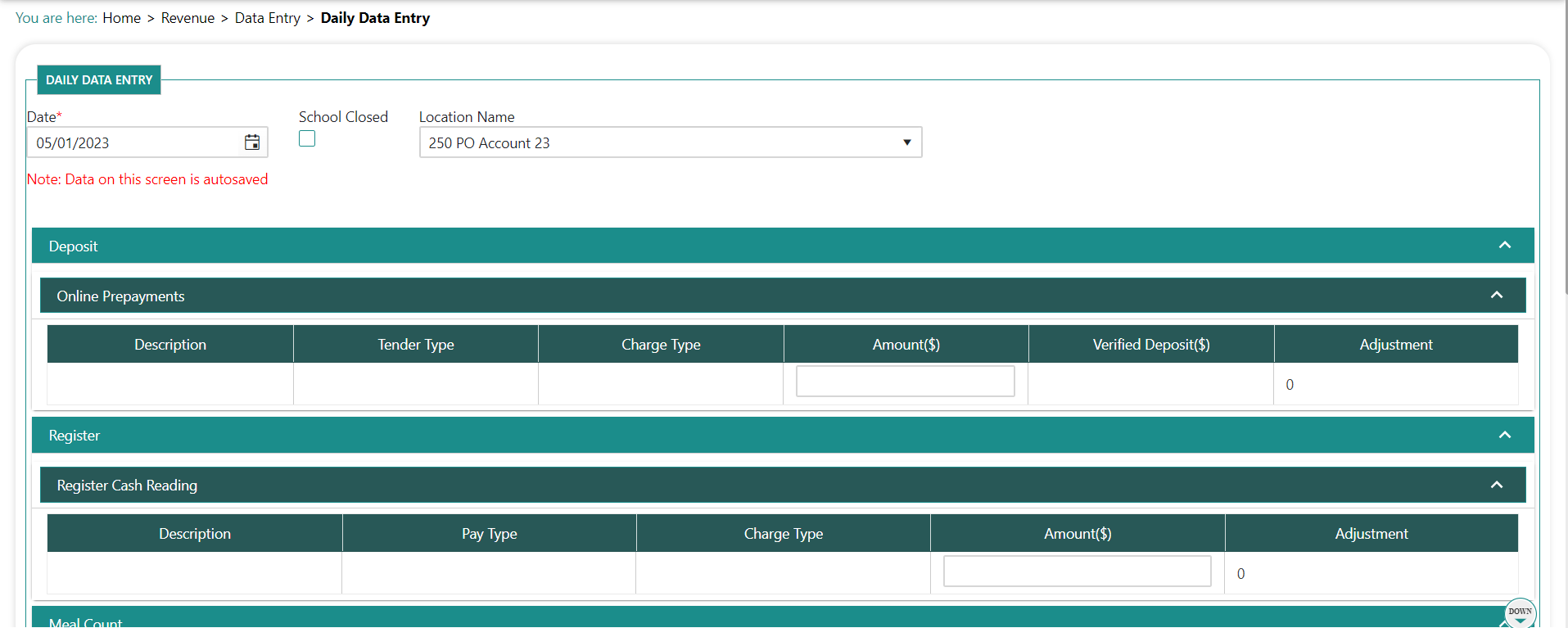 The Daily Data Entry screen is where you input daily sales in four groups: Meal Count, Sales, Register, Deposit and a Recap at the bottom. Additionally, cost plus vending is entered here. After you tab out of a field the information is saved automatically. You cannot enter data for future dates.