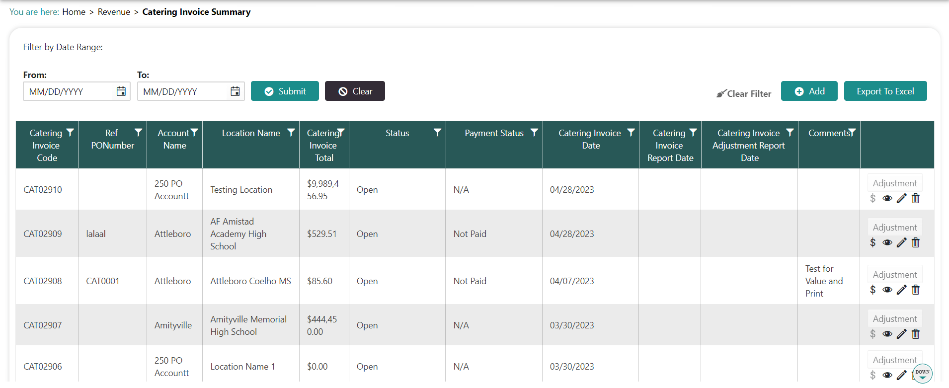 The Catering Invoice Summary screen shows a list of invoices for your location(s) along with their current status. From this screen you can you can record payments, edit an invoice, create an adjustment and export invoices to Excel.