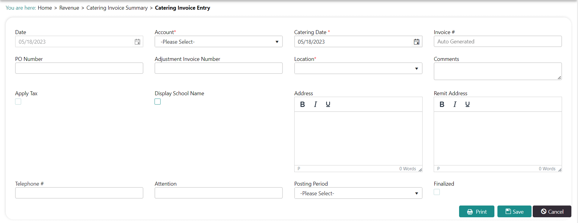 You create a new invoice from the Catering Invoice Summary screen. When you create an invoice it counts as a quote until you indicate a posting period and finalize it.