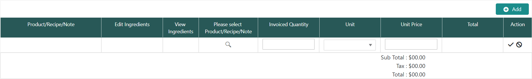 - Click + Add to add the first item in the invoice. A blank line item appears: