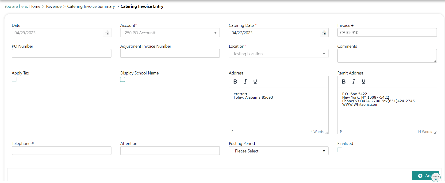 Accounts that use district or Whitsons catering must create a catering invoice for each catering event.