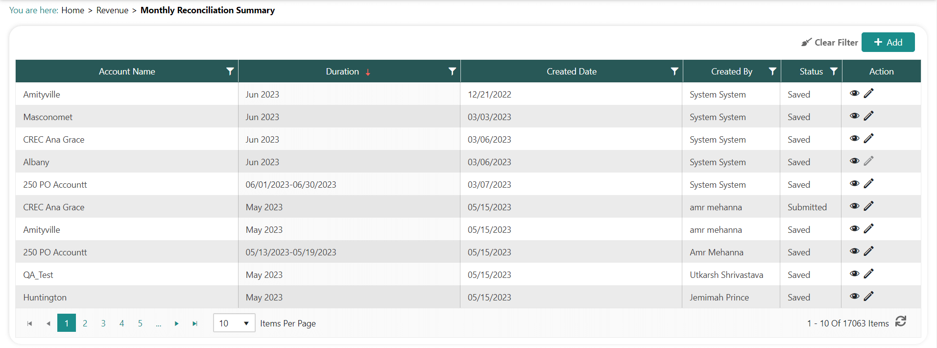- Click Revenue>Reconciliation from the left navigation. The Monthly Reconciliation Summary screen appears: