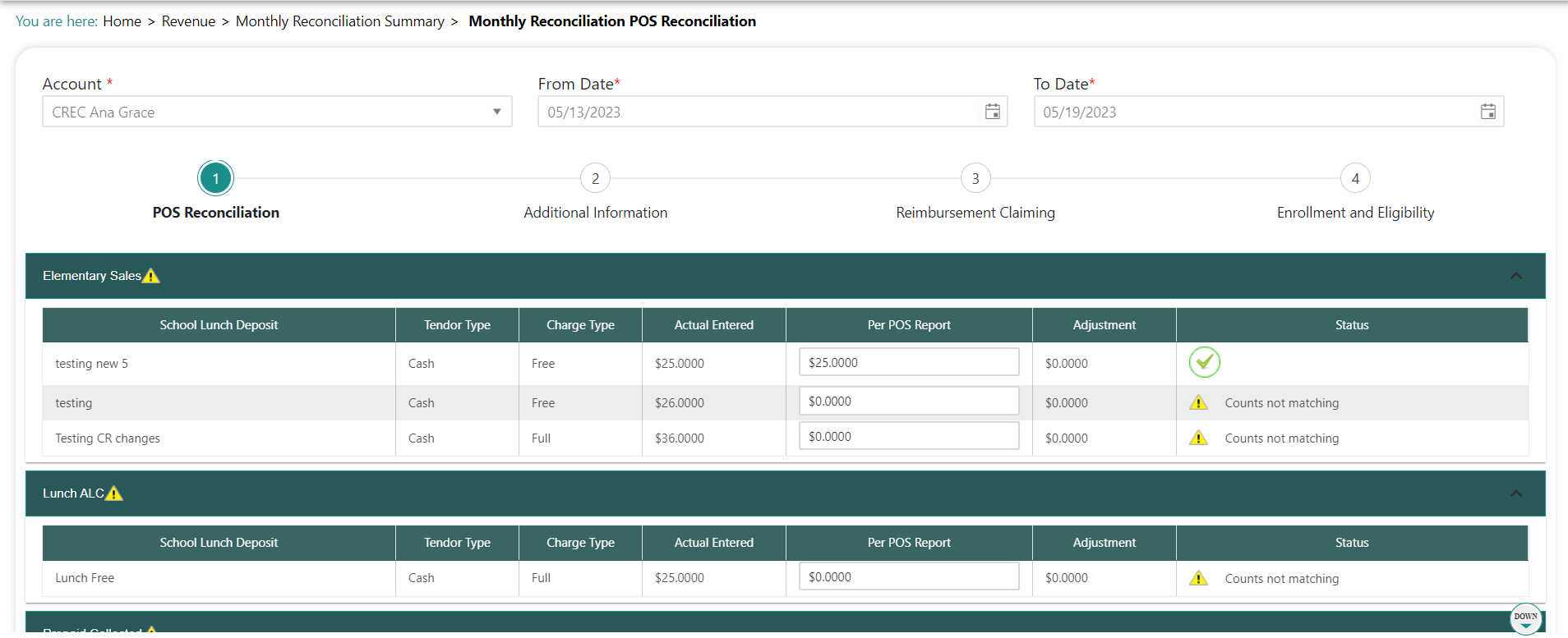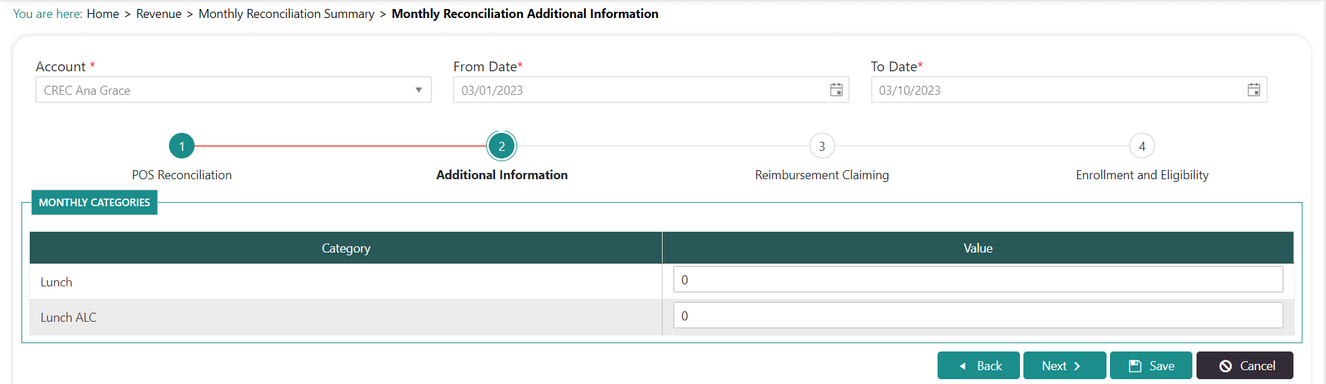 - If the free/reduced meal enrollment numbers for this month are not correct, you must make the correction on the Revenue>Enrollment & Eligibility screen, then come back to the reconciliation process.