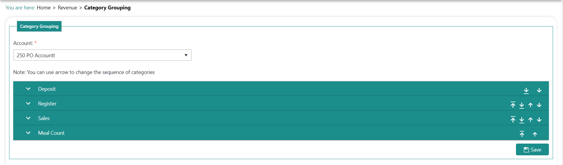 Click Revenue> Category Grouping from the left navigation. The Category Grouping screen appears.