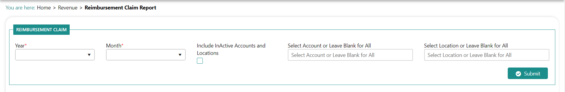 Click Revenue>Reports>Reimbursement Claim Form. You are prompted to input report parameters: