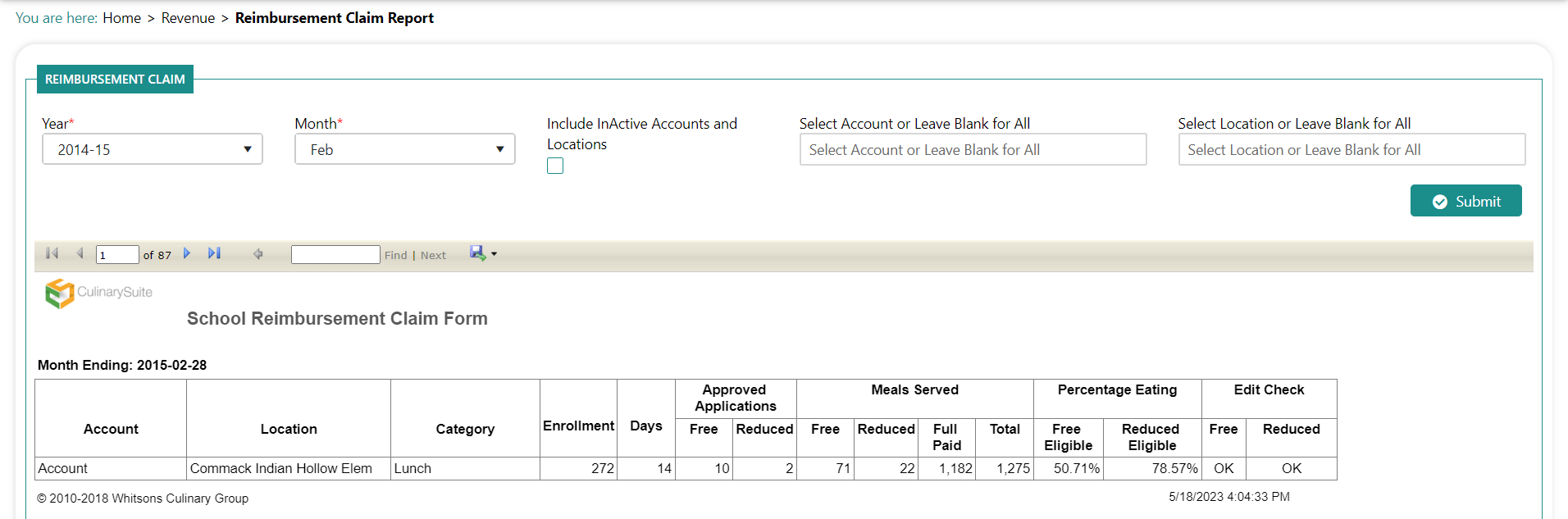 The Reimbursement Claim Form report displays the reimbursable meals served and displays "ERROR" if the count exceeds the number who were eligible to receive them. You cannot be more than 100% claimed.