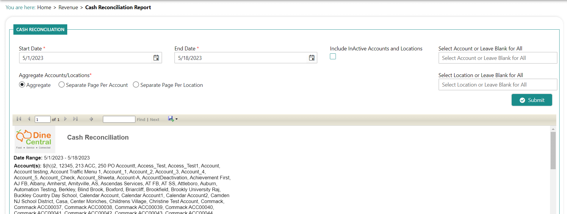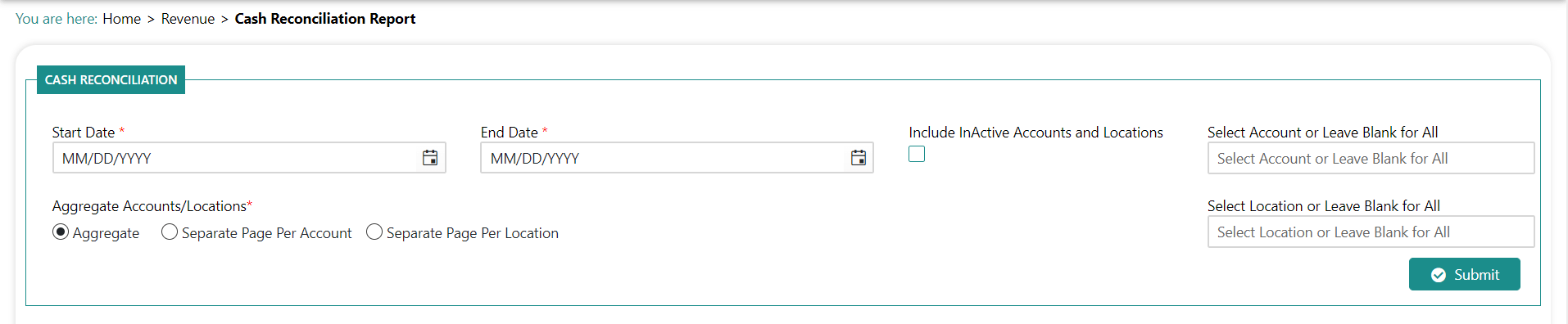 The Cash Reconciliation report shows the breakdown of the total deposit amount for account(s) or location(s) based on the data entered into the revenue entry screen. You can select one account/location or all those you have access to. If you choose to list all accounts/locations, you can indicate whether you want the report to display each on a separate page or summarize/aggregate all of the data onto one page.