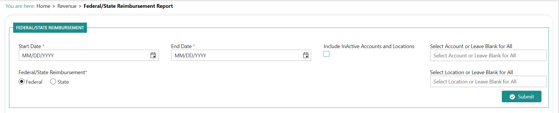 Click Revenue>Reports> Federal/State Reimbursement. You are prompted to input report parameters: