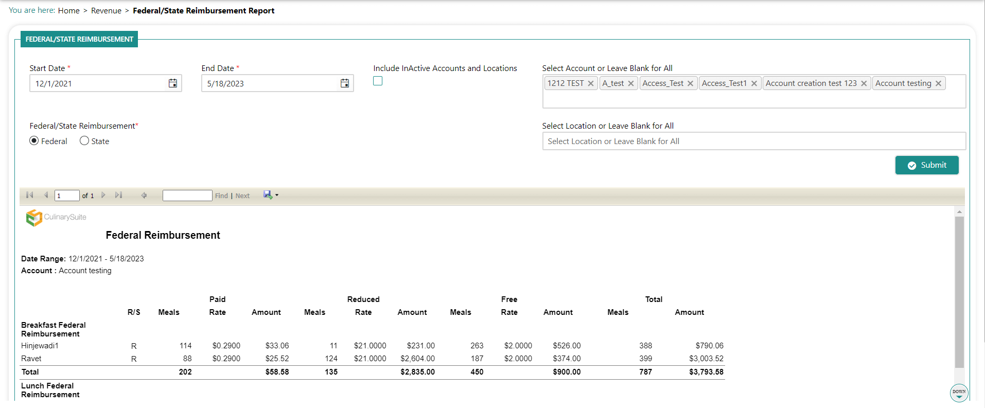 The Federal/State Reimbursement report displays the federal or state reimbursement meals, rates and totals by category and charge type (e.g. free reduced, full).