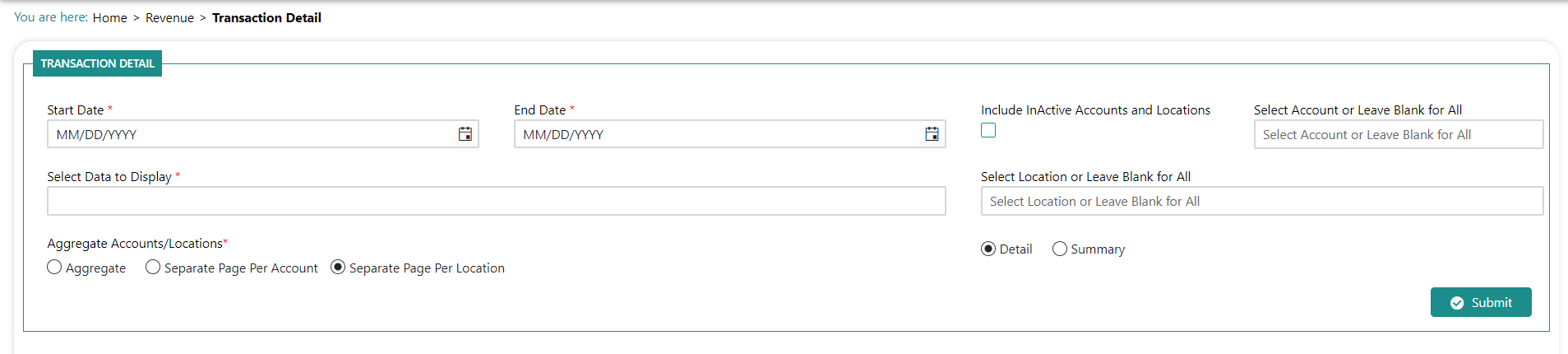 Click Revenue>Reports>Transaction Detail. You are prompted to input report parameters: