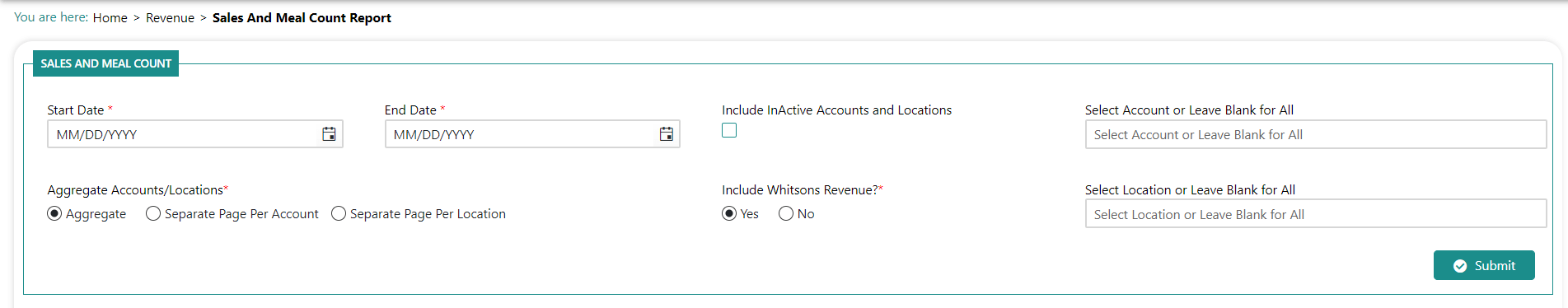 Click Revenue>Reports>Sales & Meal Count. You are prompted to input report parameters:
