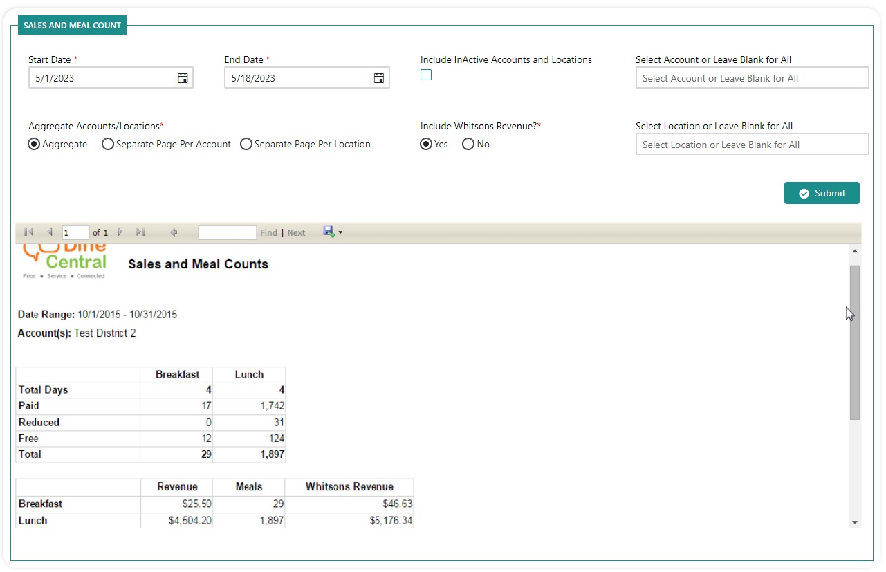 You can view the sales and meal counts at the district level using the Sales & Meal Count report.