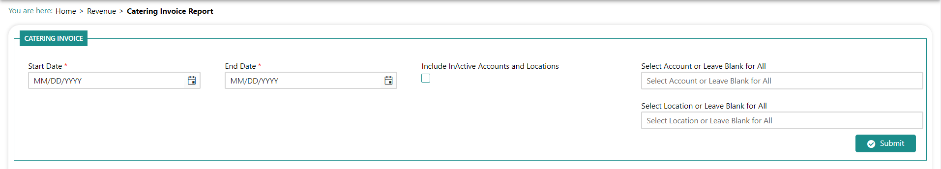 Click Revenue>Reports>Catering Invoice. You are prompted to input report parameters: